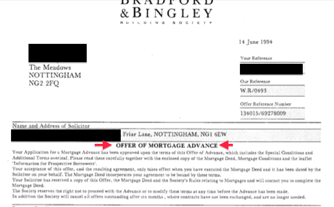 Your Application for a Mortgage Advance has been approved upon the terms of this Offer of Advance, which includes the Special Conditions and Additional Terms overleaf.”