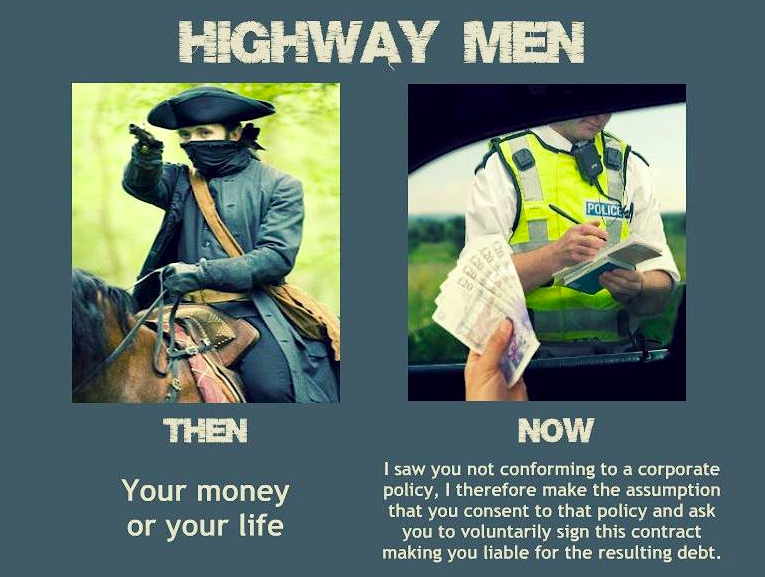 Man has the unalienable freedom to travel where and whenever he chooses. Any agency or individual who prevents him doing so is operating unlawfully. The Driver and Vehicle Licencing Agency [DVLA] and those Bozoes in Dayglow jackets masquerading as policemen are effectively modern day highway robbers in that they use threats and coercion to demand moneys from those who have been duped into believing they require a licence to travel around in their private internal-combustion-engine-powered carriages (‘cars’), when in reality there is no such necessity.