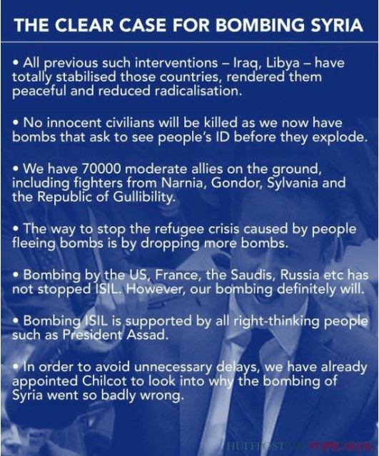 In any event, the ‘House of Commons’ vote of 02 December 2015 was cast by those faux statists and what was particularly astonishing is that amongst the war-mongers of the ‘Labour’/Fabian Hue, at least 30 of those who voted to bomb the feck out of the country are women, which would indicate that they inherently and falsely believe that states have the right to initiate acts of violence against citizens of other countries, as casualties inevitably mount once the Royal Airforce’s missiles start to fly. Those women should be ashamed of themselves, every bit as much as the rest of those who voted to bomb. They are at best tragically ignorant of the grotesque puppet show they act in or, at worst, chronic examples of a womanhood that has been strangled by feminism and fallen for the lies of the statists.