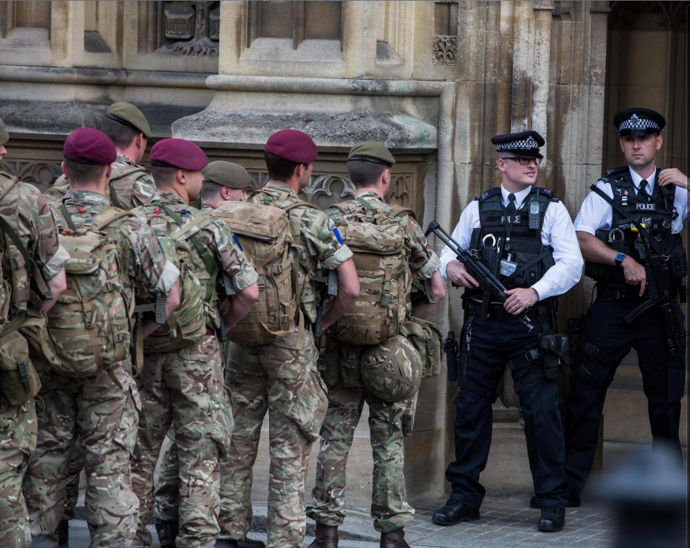 As a consequence, armed troops are deployed alongside armed cops across the streets of Britain. These men with guns are largely stationed outside Buckingham Palace, Downing Street and Parliament.