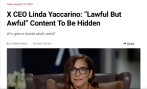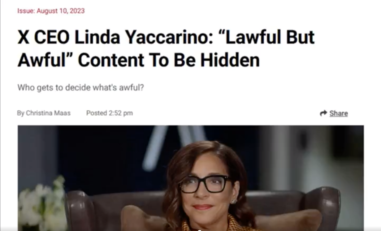 2. ‘Twatter’, now known as X, was always a tittle-tattle platform, which back in 2013, was largely a vehicle for those who are fluent in epigrams, of whom the self-confessed-sodomite, Steven Fry was a classic example. Now it is primarily an echo-chamber of data-harvesting, nominally controlled by the Arch-Prince of Prats, Elon Musk, a puppet who wants to put an electronic chip in the brain, falsely claims to have launched his ridiculous motor-car into space and wants to colonise Mars. The CEO of X, Yaccarino is a woman who is well-versed in Double-Speak as illustrated by this class example of how she falsely claims users will have,