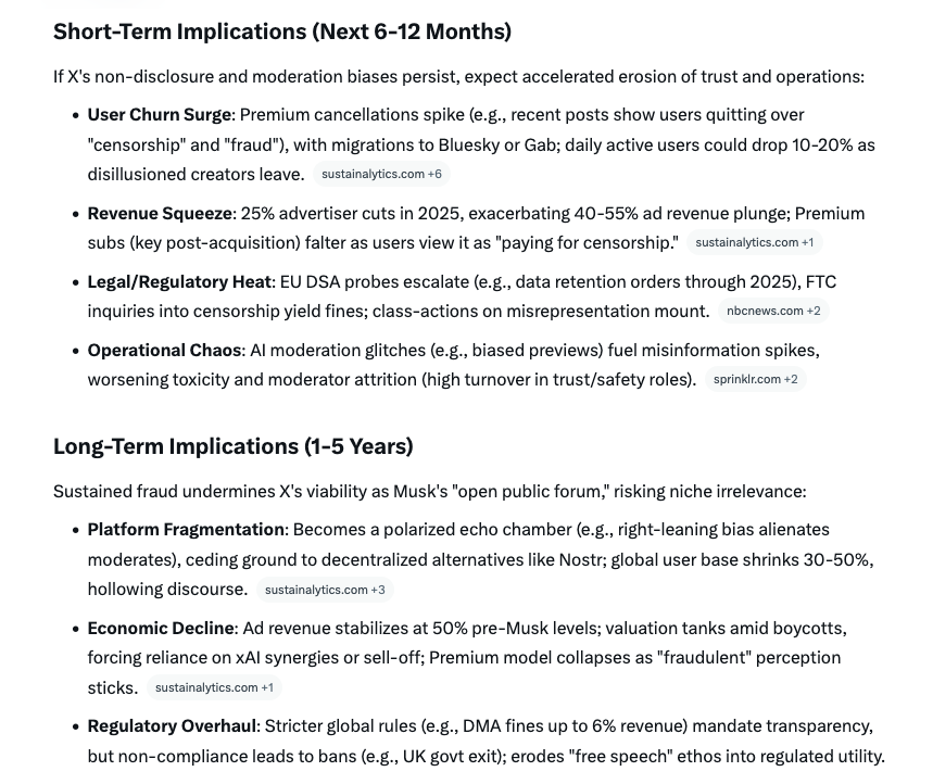In Part 1 concluded that it is, essentially, a fraudulent one. Using X’s own AI facility, Grok, this critique takes it a stage further, with particular emphasis on what the short and long term implications are for the platform’s survival and associated revenue streams in the light of its various suppressions, disinformation and fraudulent representations: