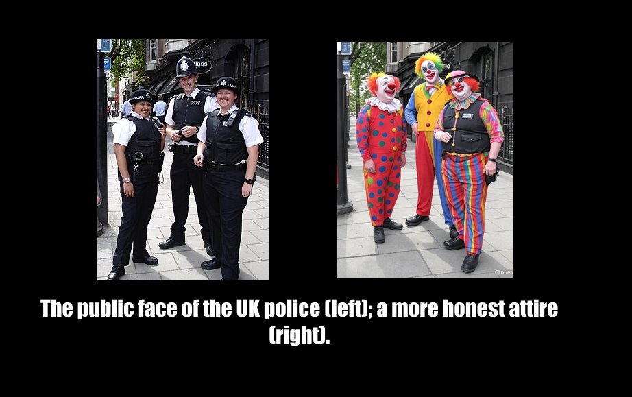 In other instances, the bovine cops may claim someone is ‘transphobic’ of ‘homophobic’. All of which would suggest it is high time the cops, just like the 650 traitors in Parliament, ditched their uniforms and donned red noses and clown costumes instead: