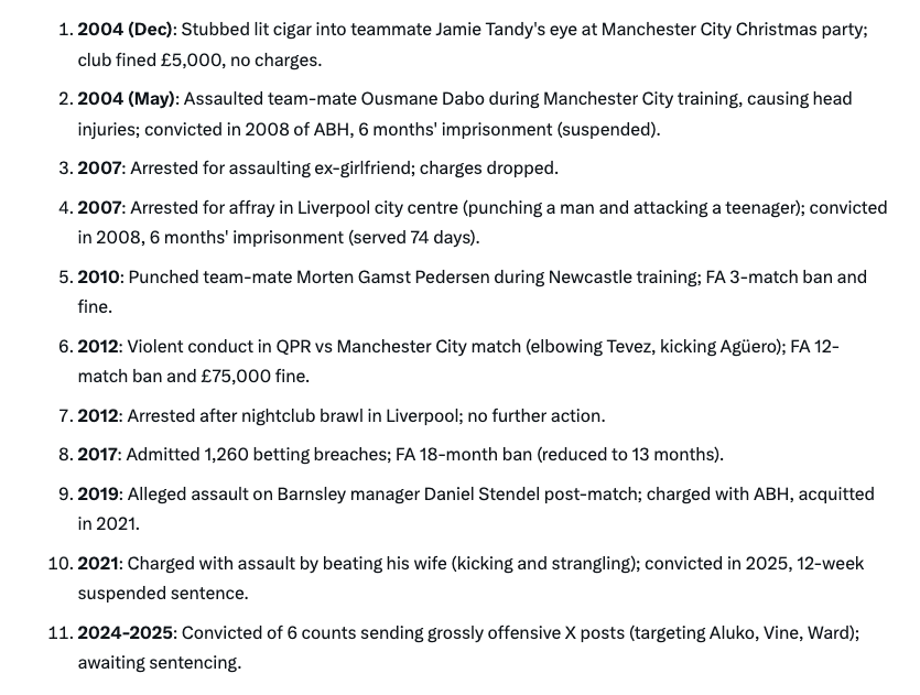 I’m rarely impressed with mouthy footballers but willing to acknowledge genuine intelligence and wit when I see it but it’s always relative and by that low bar, Barley can parley more articulately than most. However, he does have a history of being unable to control his emotions. One example which springs to mind is when he stuck a cigar in a fellow player’s eye. The following is a list of the various incidents when he has evidently reacted in an emotional way to whatever the occasion was. The immediate thing that stands out is that, according to the list, he has not gone more than 3 years without some kind of ‘episode’. 11 episodes in 21 years is a psychological pattern and it doesn’t take a psychiatric quack to point out that Barton is unable to control his emotions at certain moments: