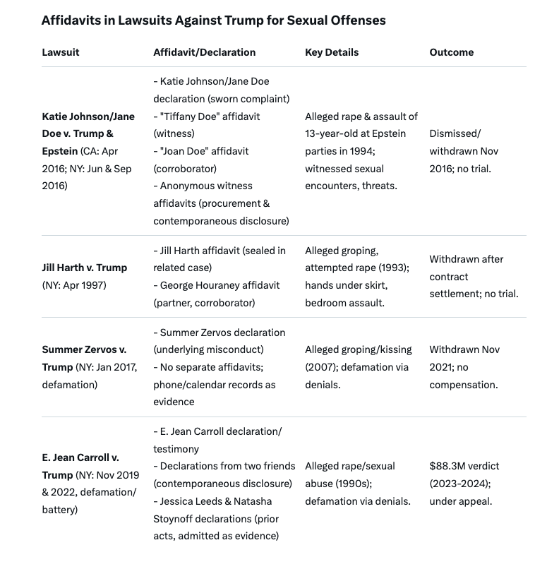 For Trump, it the Epstein connections, the considerable testimony in the victim Affidavits filed in lawsuits against him, his out-of-court settlements with women who have filed claims against him for sexual misdemeanours: