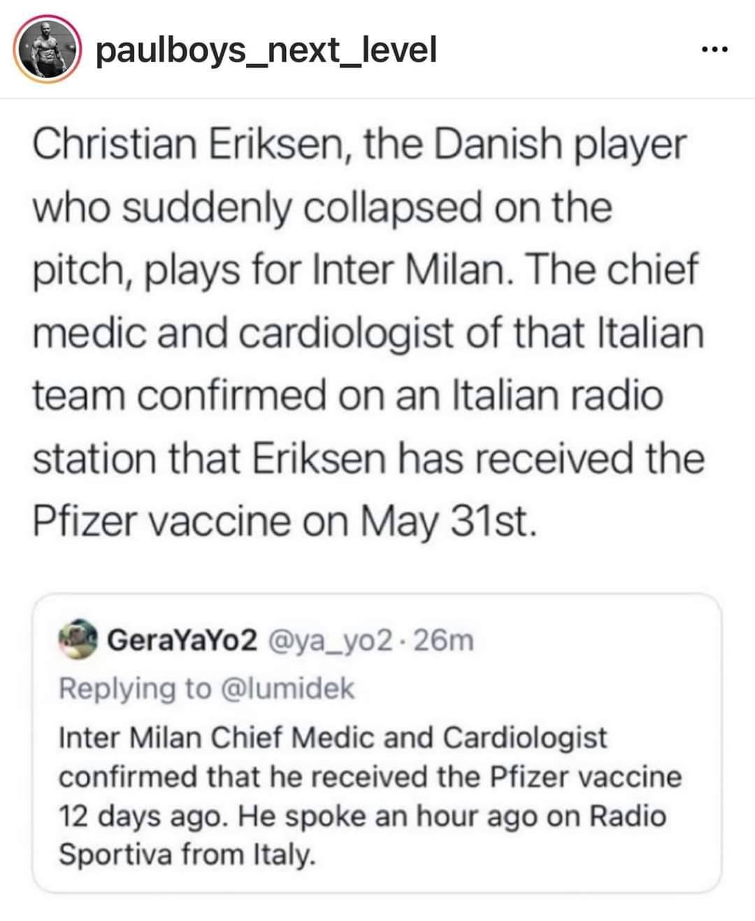 Whilst millions of viewers witnessed this via the all-pervasive cameras that were relaying the match around the world, there is now an all-out attempt to control the narrative – an exercise that seeks to dissociate his cardiac arrest with the possible injection of the vile vial of MRNA genetic modification treatment falsely classified as a ‘vaccine’, into his highly valued body.