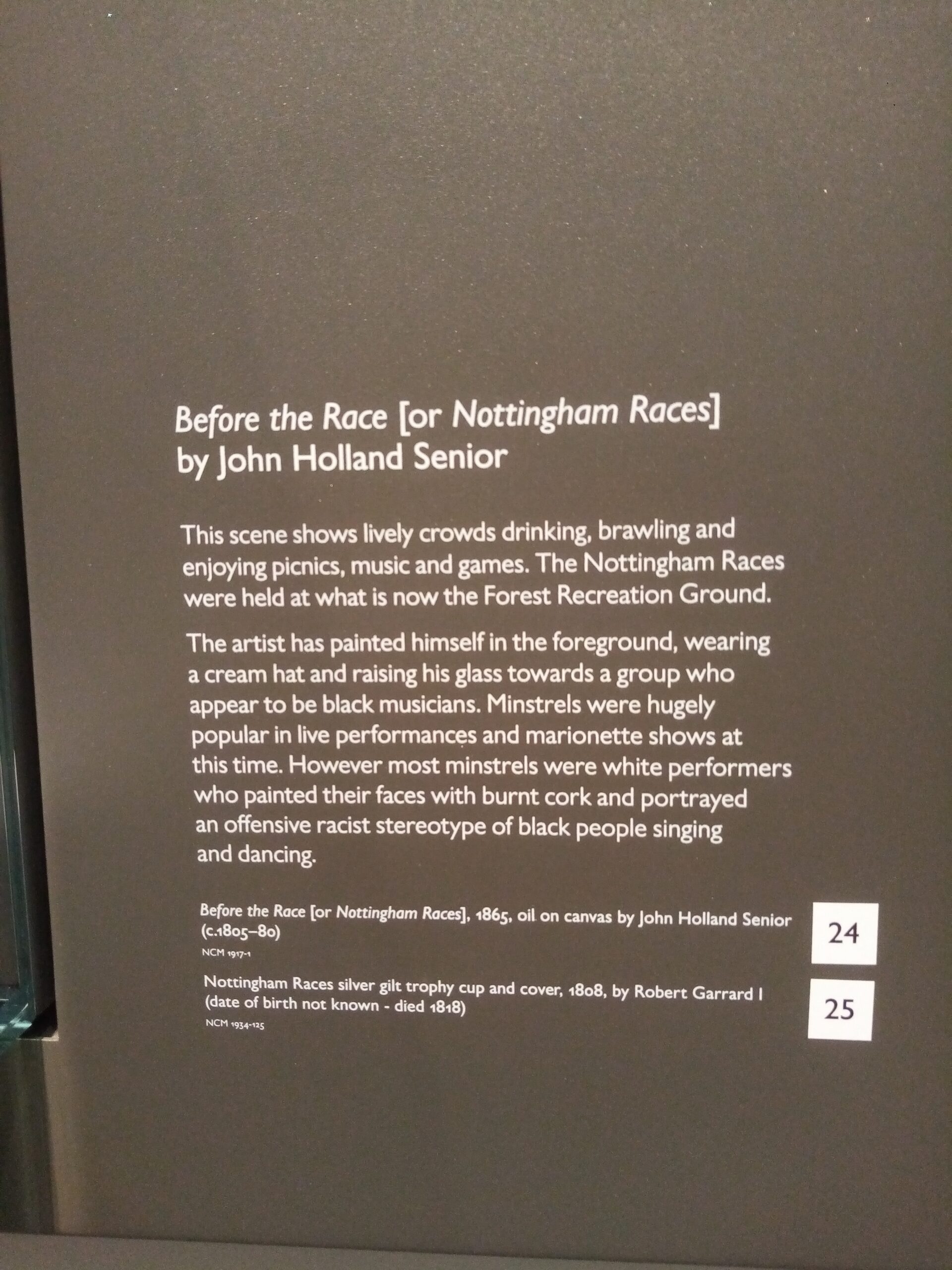 In the art gallery upstairs, there is a painting of a scene from Nottingham’s ancient Goose Fair. Of all the hundreds of characters in view, there a group is ‘blacked-up’ as a minstrel. Whoever wrote the title card about the picture is evidently a woke sort for he or she, rather than commenting on the remarkable overall content chooses to focus on the minstrel and offers a bizarre apology when she stupidly claims that the people were acting in an “offensive racist stereotype of black people” at the time and should, evidently, be condemned for this act of ‘blacking up’. Quite how or why the author thinks such a comment is necessary, is beyond my ken. Is she (and, I’d wager the author is a woman) of the view that the delicate sensibilities of the visitor need to be protected in some way?