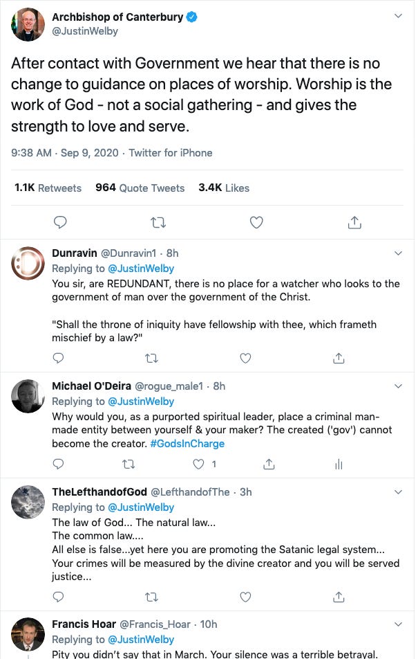 When the Archbishop of Canterbury places the criminal UK ‘gov’ as a higher authority than God, the Church of England is in serious trouble. This fact cannot be overstated for it may even usher in its very demise. A price that will be necessary for its engagement with and support of the false state. In fact, this is true of every single church which has unquestioningly followed the ‘gov’s’ Covid-1984 psyop and closed its doors to their congregations, at a time when the sanctuary and community of church was never more needed (at least, in modern memory). It is a scandalous breach of trust: