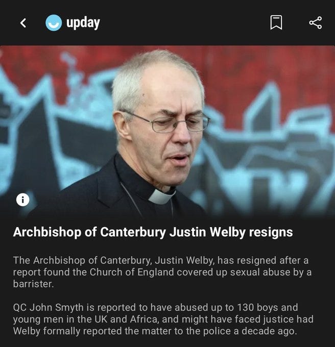 Thus, it should come as no surprise that Welby has resigned – the writing was on the wall for him from the very moment he chose to cover up the paedophile abuse and was cemented when, back in 2020, he placed the authority of the criminal state over the true creator of this realm.