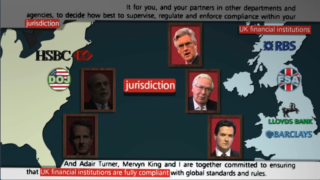 The excellent documentary, All the Plenary’s Men, details how, in 2012, the then chancellor of the Exchequeur, George Osborne, Adair Turner of the FCA and Mervyn King of the Bank of England, stepped in with a memorandum to exculpate a group of criminals operating under the aegis of HSBC, one of the Too-Big-To-Fail banking conglomerate. The US Department of Justice’s had all the evidence required to prosecute these indviduals. George Osborne wrote a letter to Ben Bernanke, head of the Federal Reserve at the time to claim that the criminals involved were above the law and under the jurisdiction of the elite banking club they belonged to.