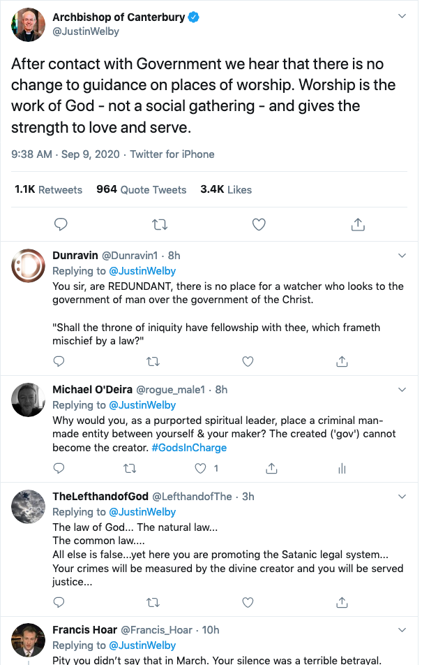 When the Archbishop of Canterbury places the criminal UK ‘gov’ as a higher authority than God, the Church of England is in serious trouble. This fact cannot be overstated for it may even usher in its very demise. A price that will be necessary for its engagement with and support of the false state. In fact, this is true of every single church which has unquestioningly followed the ‘gov’s’ Covid-1984 psyop and closed its doors to their congregations, at a time when the sanctuary and community of church was never more needed. (At least, in modern memory). It is a scandalous breach of trust: