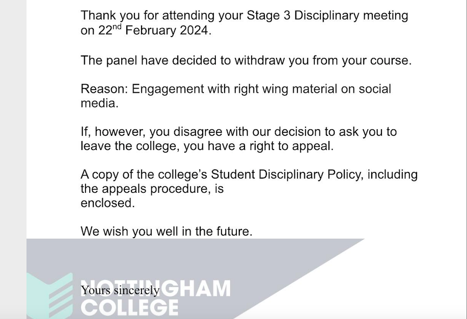 The letter from Robin Atherlay, Assistant Principal of Nottingham College and Head of the City Hub Campus, addressed to YM, states that her son was being excluded for “Engagement with right wing material on social media.”
