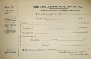 The Vaccination Act of 1898 removed penalties and included a “conscientious objector” clause, so that parents who did not believe in vaccination’s safety or efficacy could obtain an exemption certificate.