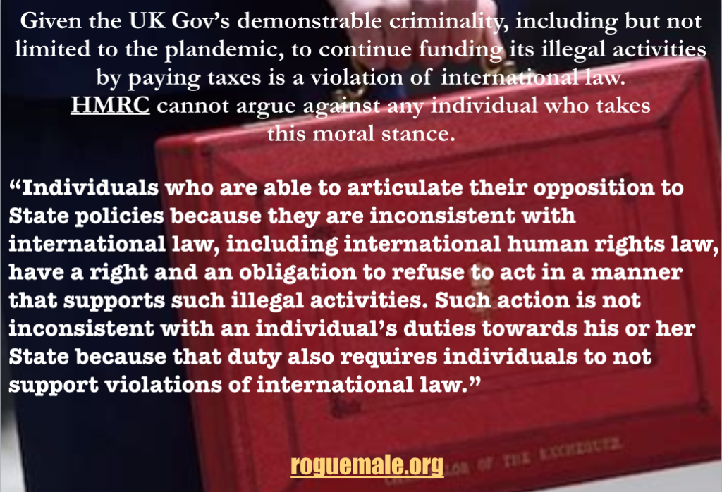 In other words, if you can articulate the how and why of the UK being a terrorist state (which is manifestly easy) then you are morally and lawfully bound NOT to give the Eugenics-lead genocidal maniacs so much as a penny. This applies to any state entity which is fraudulently claiming you owe it anything.