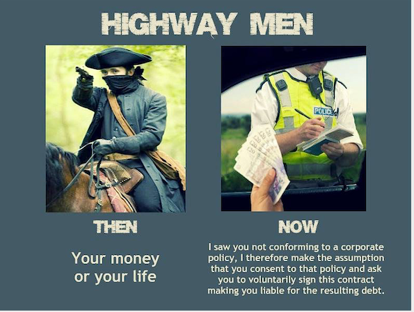 Man has the unalienable freedom to travel where and whenever he chooses. Any agency or individual who prevents him doing so is operating unlawfully. The Driver and Vehicle Licencing Agency [DVLA] and those Bozoes in Dayglow jackets masquerading as policemen are effectively modern day highway robbers in that they use threats and coercion to demand moneys from those who have been duped into believing they require a licence to travel around in their private internal-combustion-engine-powered carriages (‘cars’), when in reality there is no such necessity.